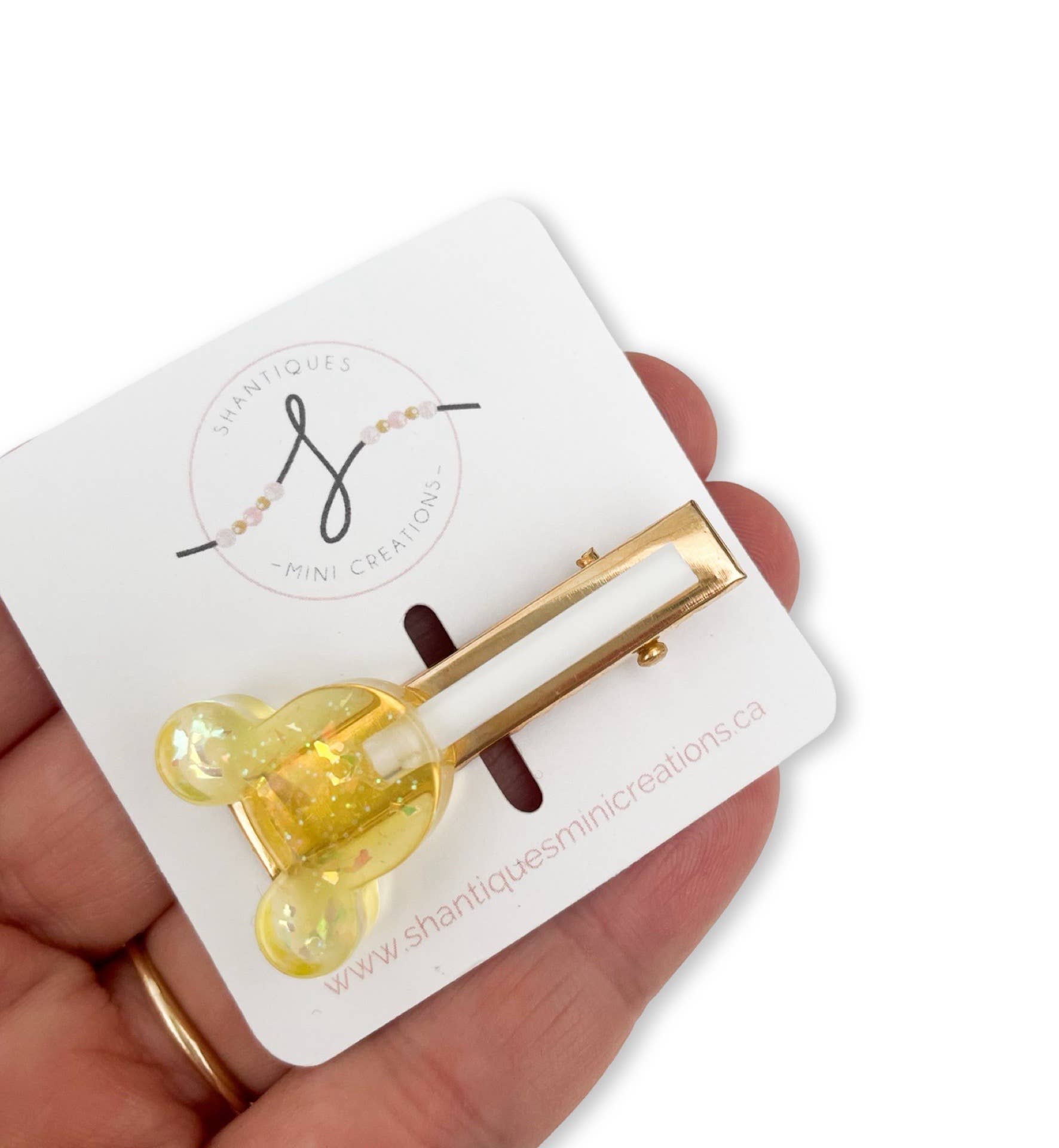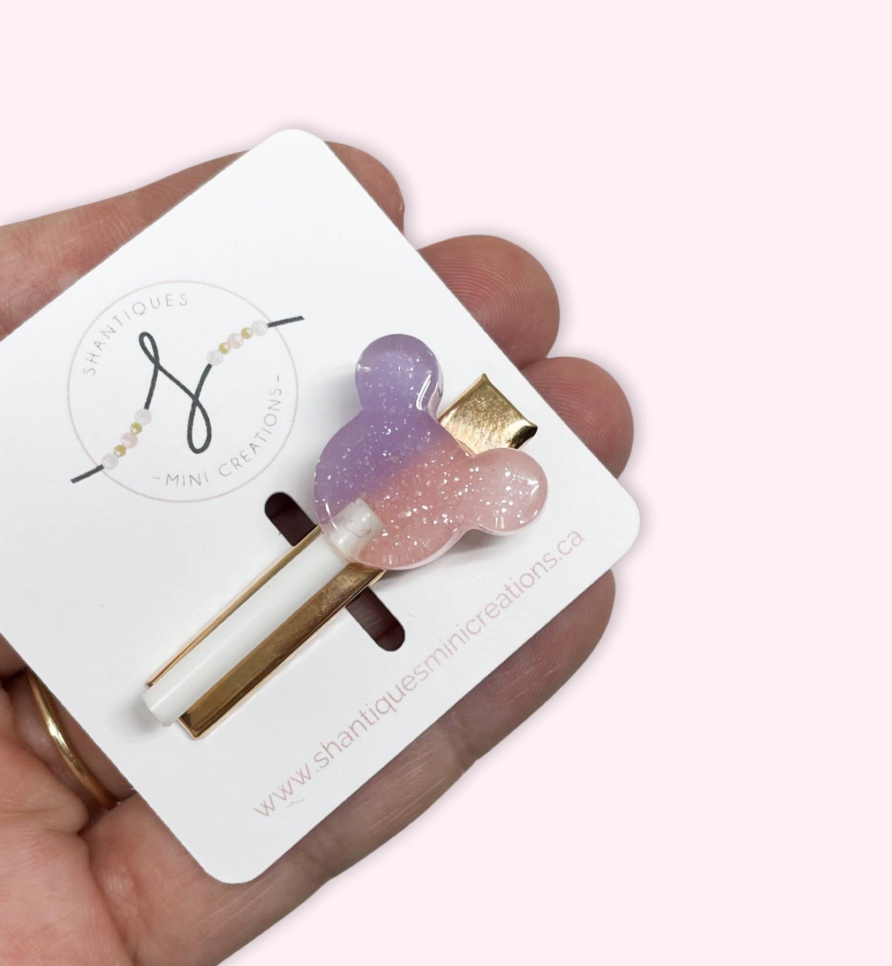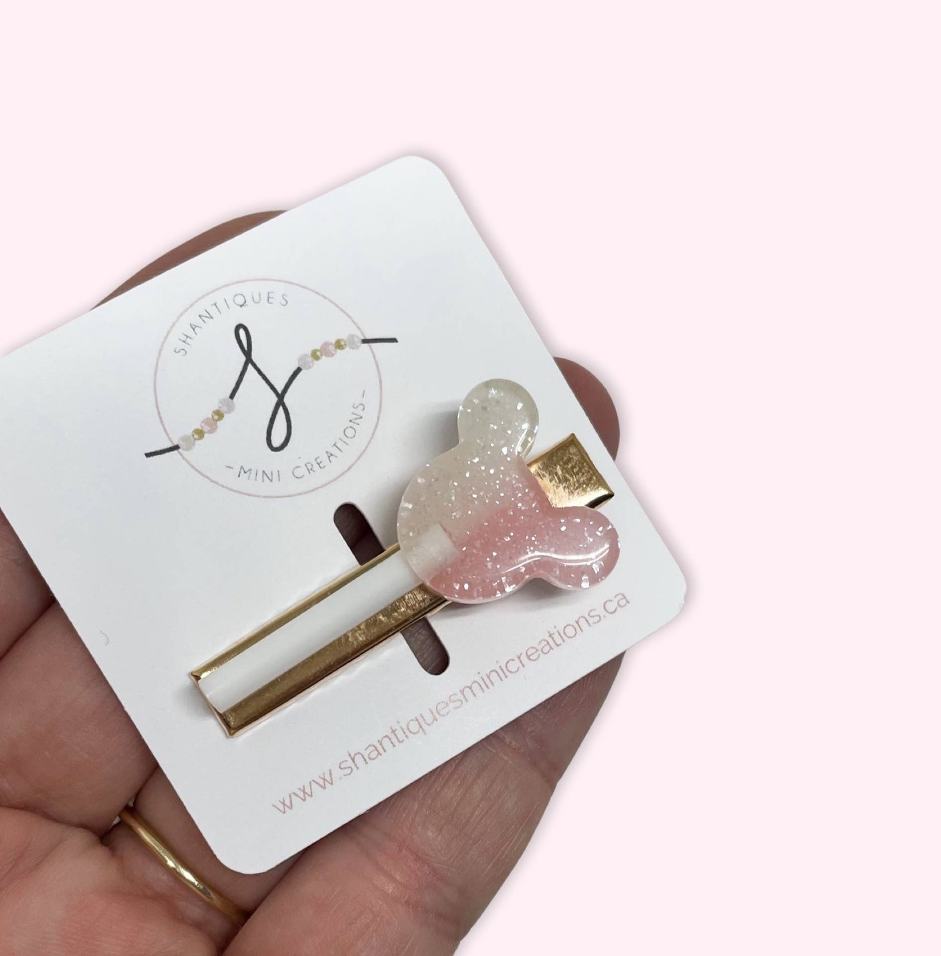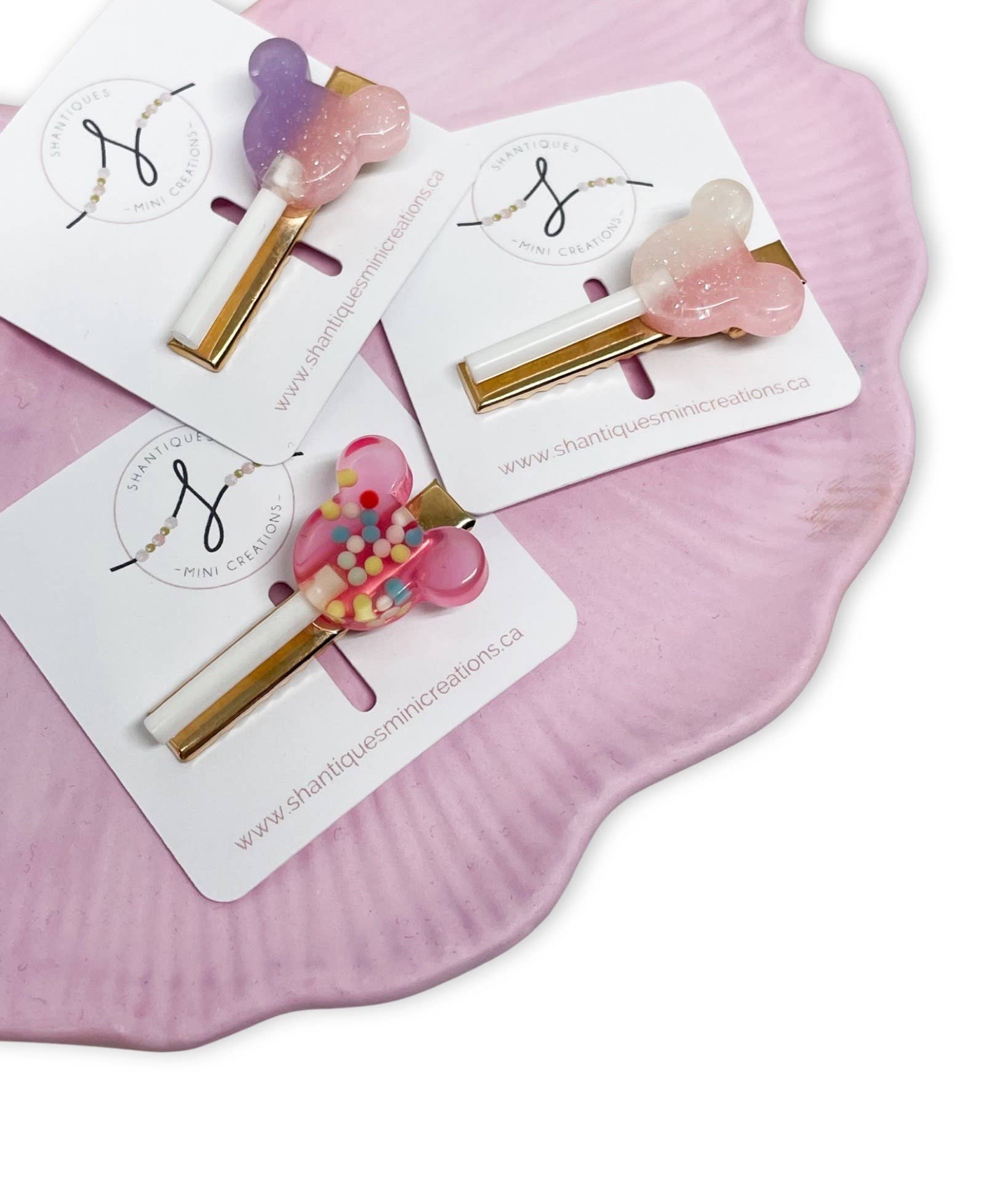 A lollipop themed embellished alligator bar clip alligator clip with small teeth - perfect for medium hair NOTE - the confetti one will vary slightly in colour (light to darker shades of pink) This is for One clip They can be done on either the right or left side of the clip Clip direction