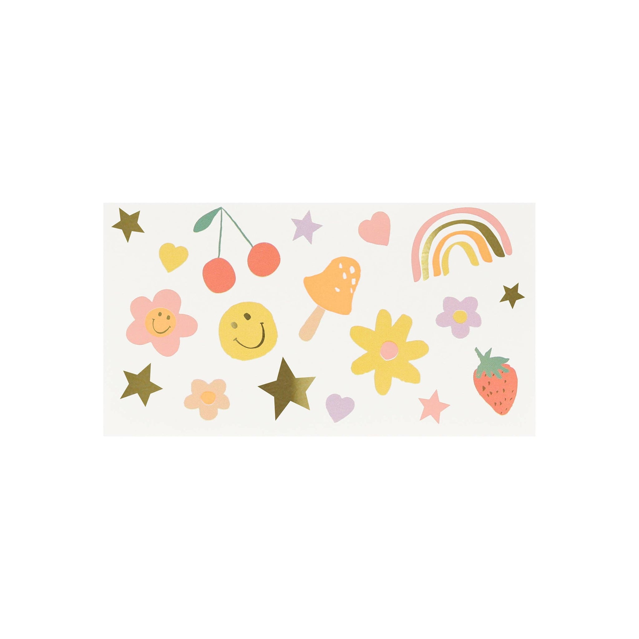 Our temporary tattoos are great for a party activity, for imaginative play on a rainy day, or as party bag gifts to delight your guests. This set features happy icons to make everyone look and feel on top of the world!
