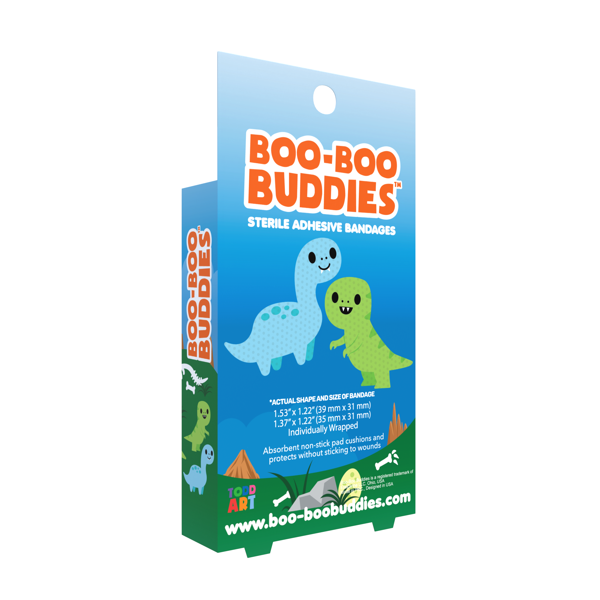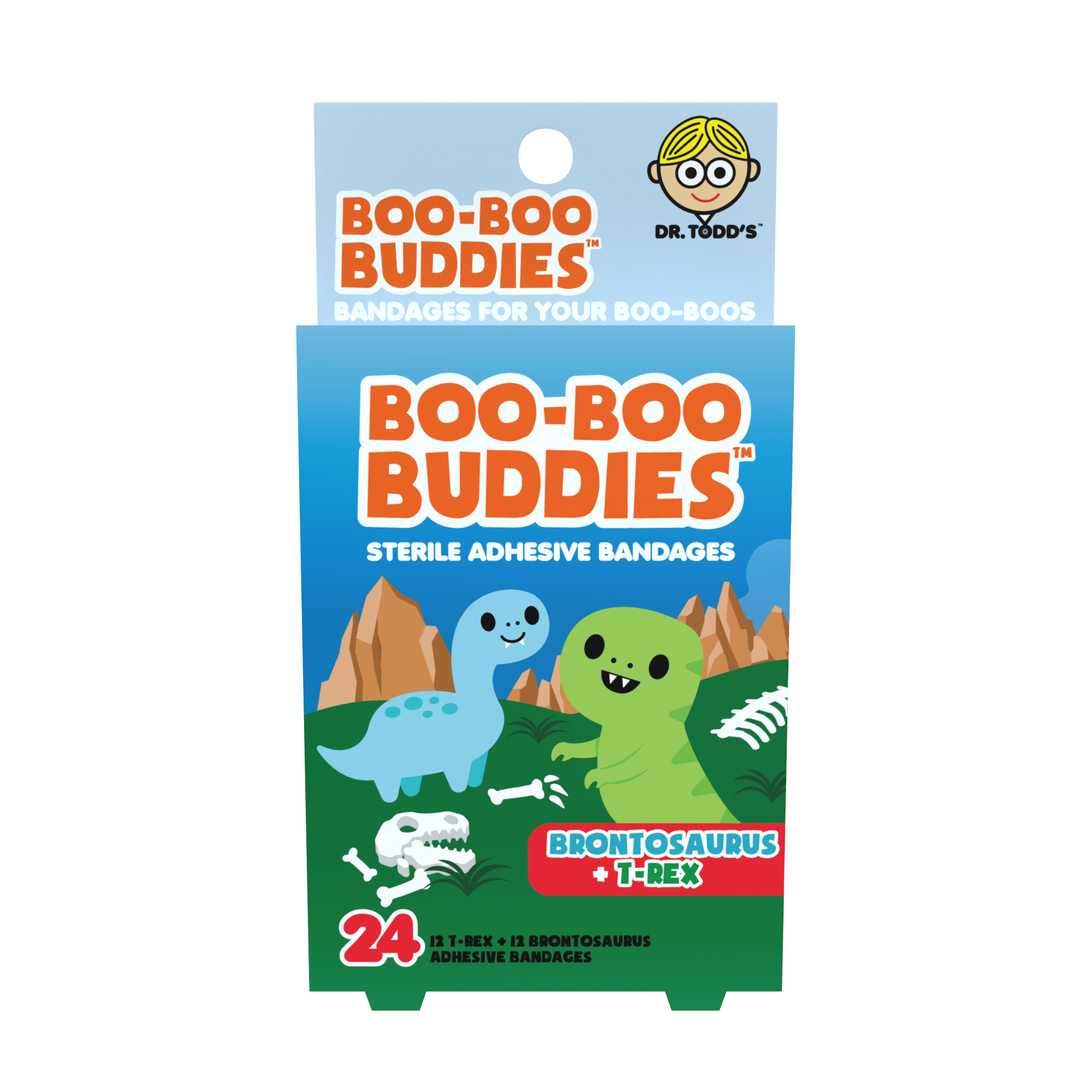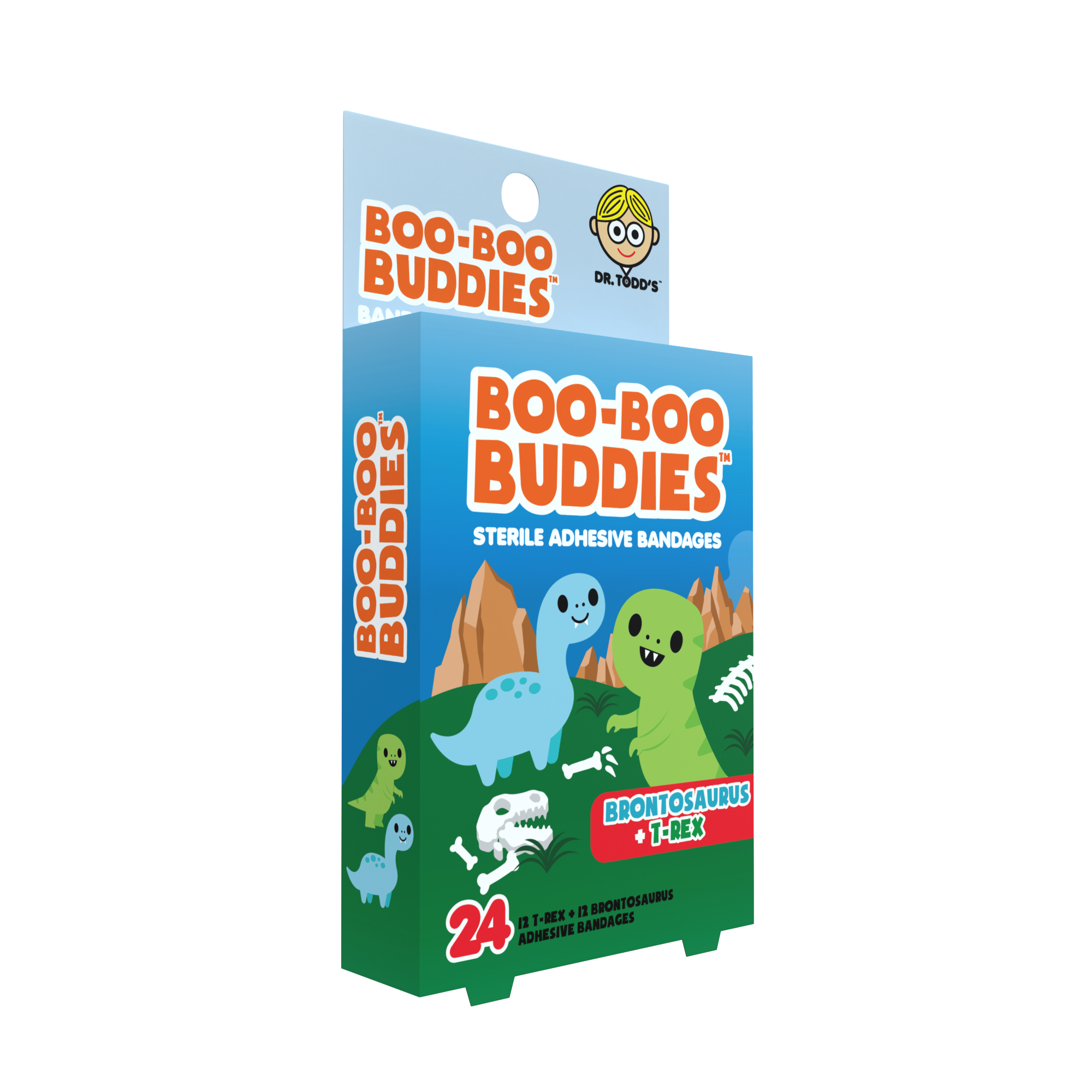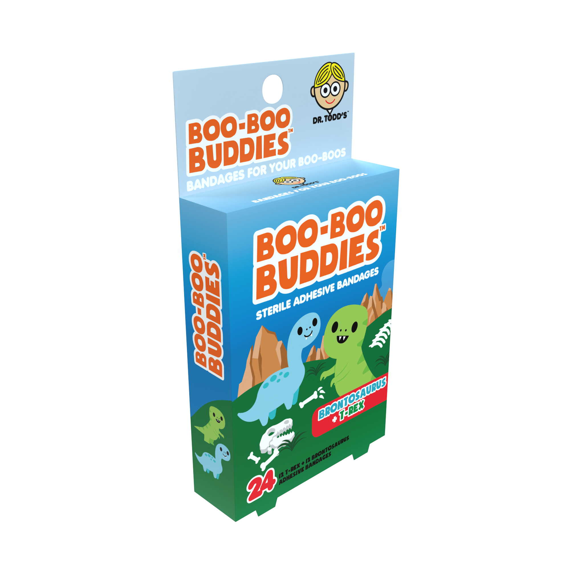 Playful Brontosaurus and T-Rex character bandages designed to make everyday boo-boos feel less scary. Fun dinosaur-themed designs create strong shelf appeal for gift, kids, and wellness sections. Part of the Boo-Boo Buddies® character bandage series — ideal for assortments and repeat reorders.