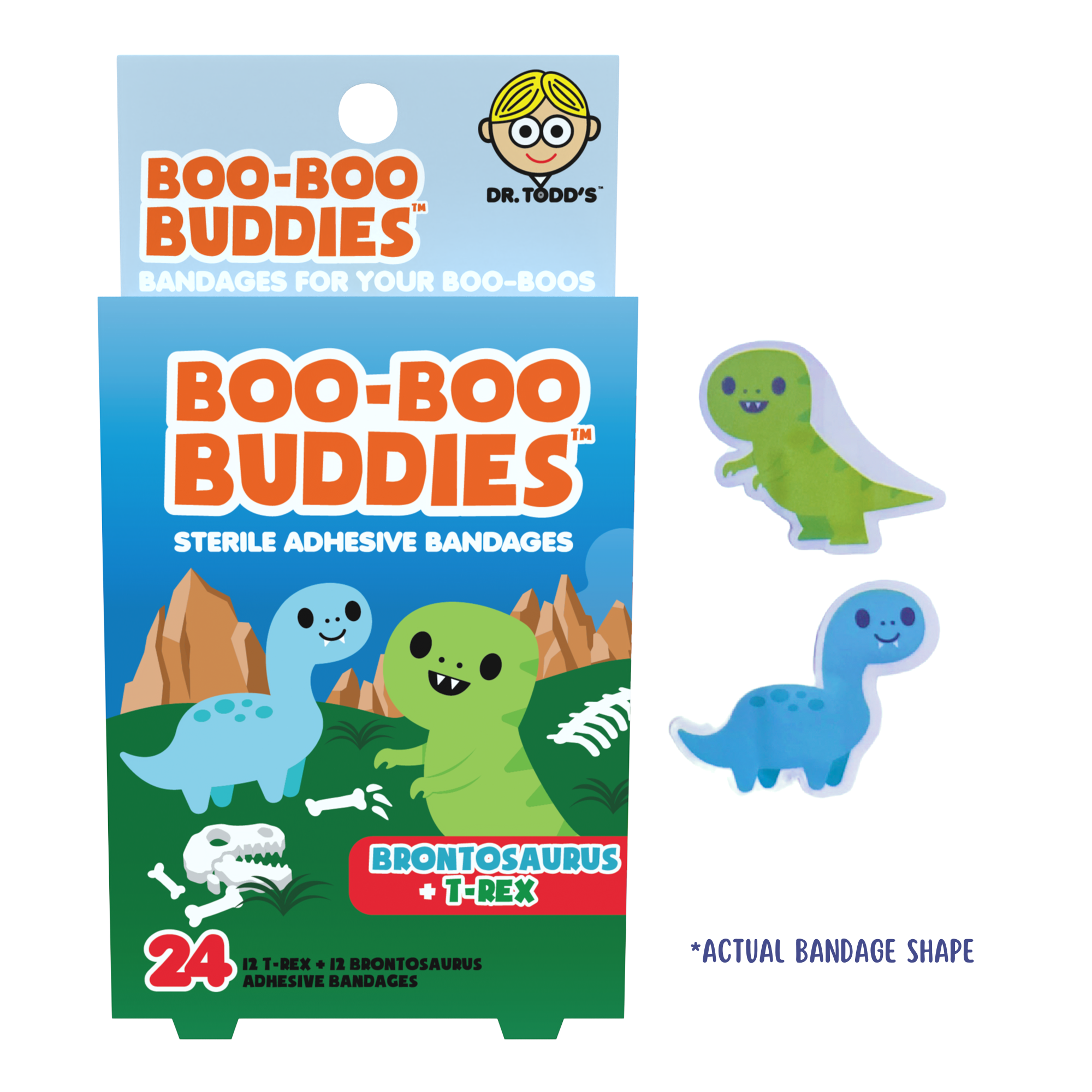 Key Features * 24 bandages per box (12 Brontosaurus, 12 T-Rex) * Latex-free adhesive suitable for sensitive skin * Individually wrapped * Designed for kids ages 3+ * Strong visual appeal for retail displays Details * Bandage shapes: Brontosaurus, T-Rex * (12) Brontosaurus: 1.53 × 1.22 inches * (12) T-Rex: 1.37 × 1.22 inches * Sterile adhesive bandages * Country of origin: China